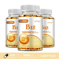 Nahrungsergänzungsmittel zur Unterstützung des Energiestoffwechsels: Diese Vitamin-B12-Softgels helfen dabei, Nahrung in die Energie umzuwandeln, die Ihr Körper den ganzen Tag über benötigt.