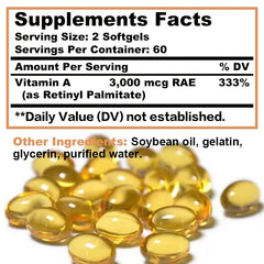 Daily intake of Vitamin A helps support healthy vision and boosts immune system function, which promotes overall health*. This product is Vitamin A Palmitate, a fat-soluble form of Vitamin A that may be especially beneficial for the eyes and skin. This and other great health benefits are packed into each easy-to-swallow, fast-release softgel.